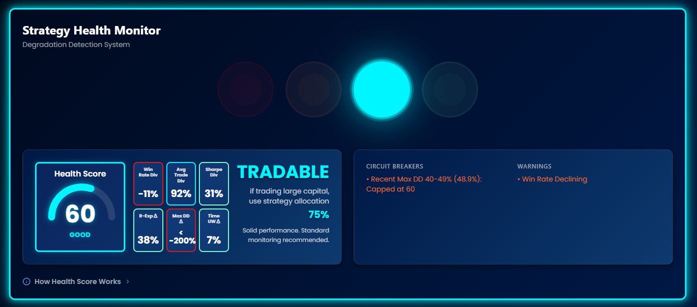 The Health Score (0–100) detects whether a strategy is degrading over time. Unlike the other scores which evaluate absolute performance, the Health Score compares recent performance against historical baselines. It's your early warning system.
